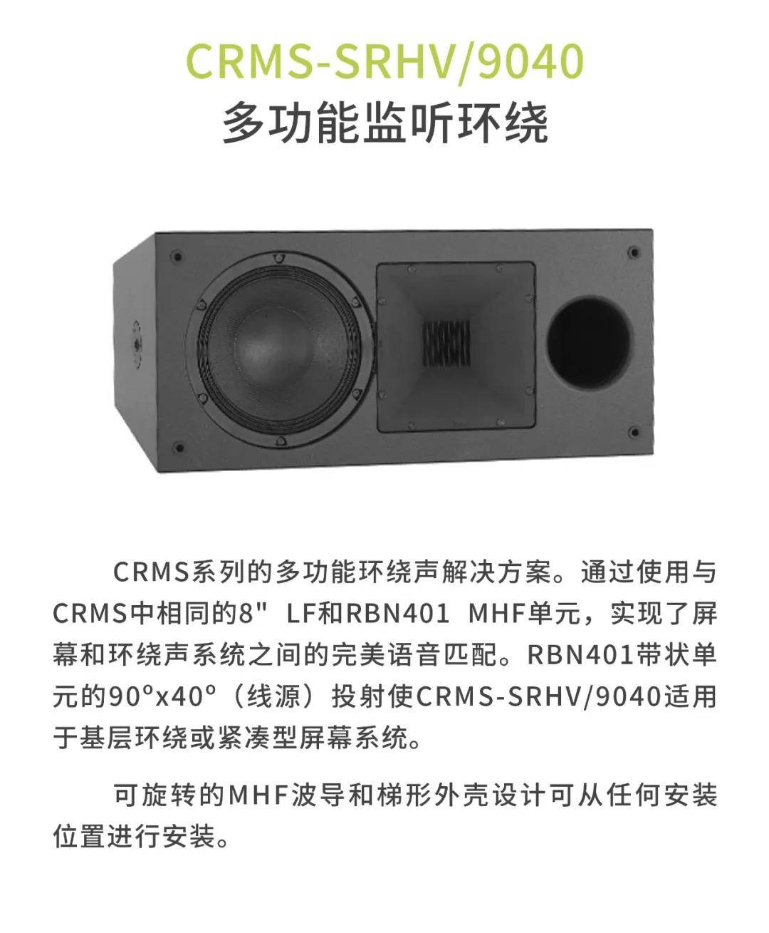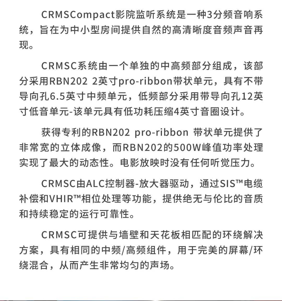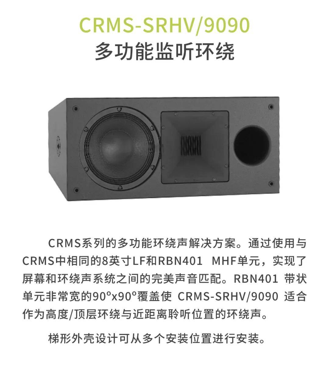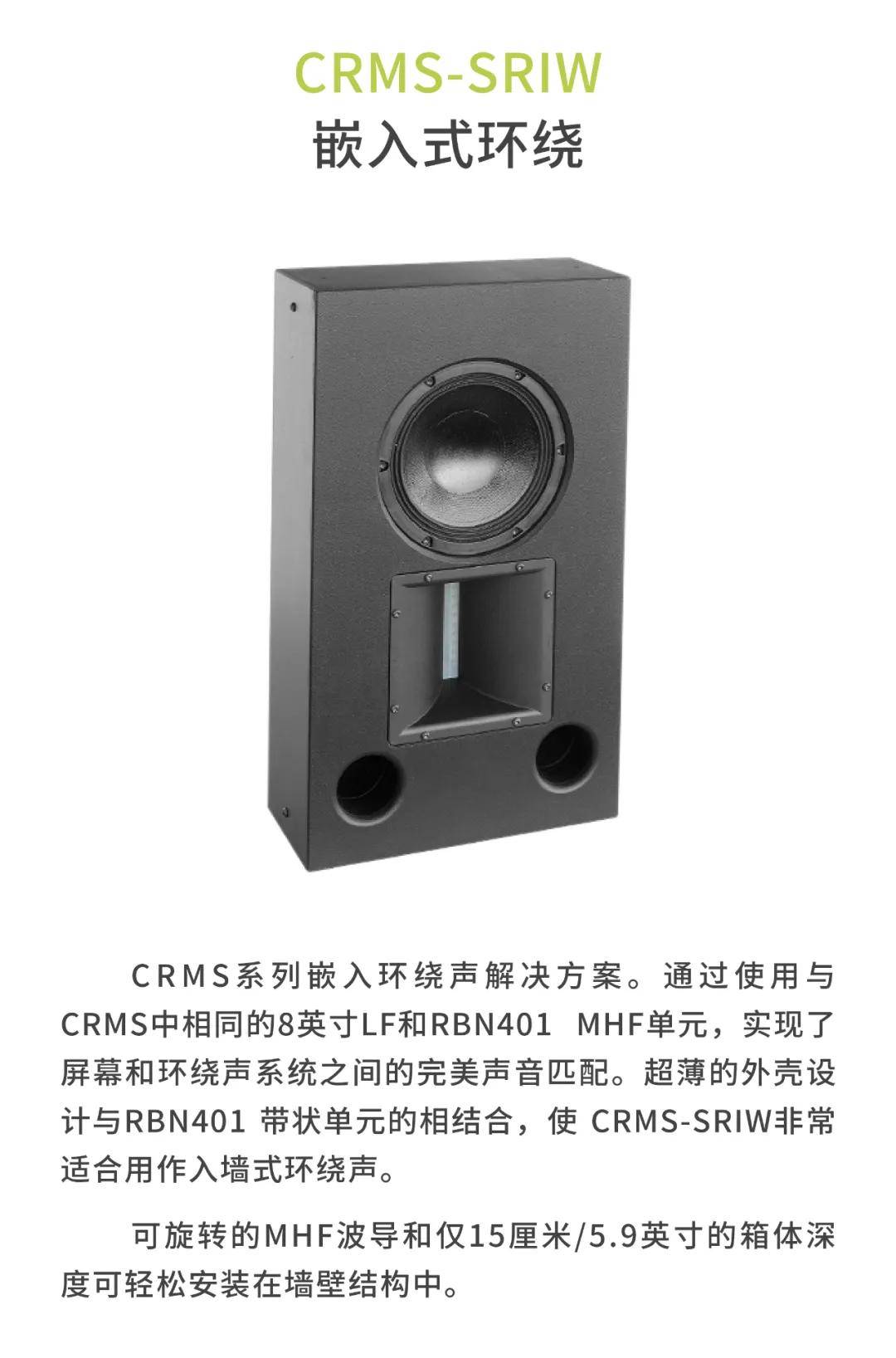 CRMS系列能提供HiFi声质以及完美的清晰度,让观众长时间观看电影都不会出现听觉疲劳。声压级覆盖整个空间,大大提升远离屏幕的观众听觉上的享受,让所有观众都能感受身临其境的效果,让观众与电影更亲近。