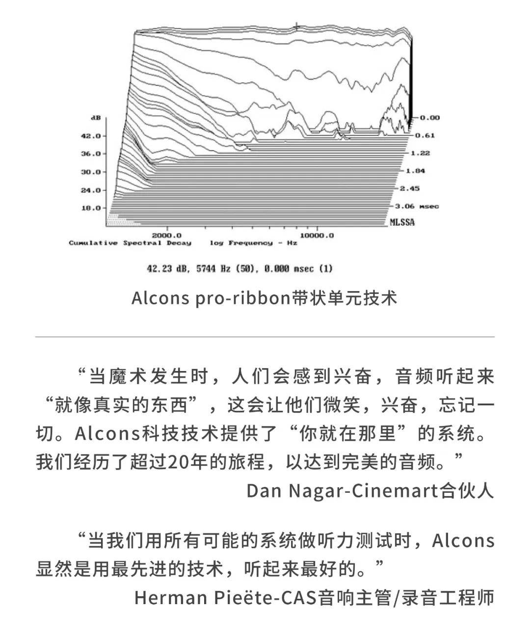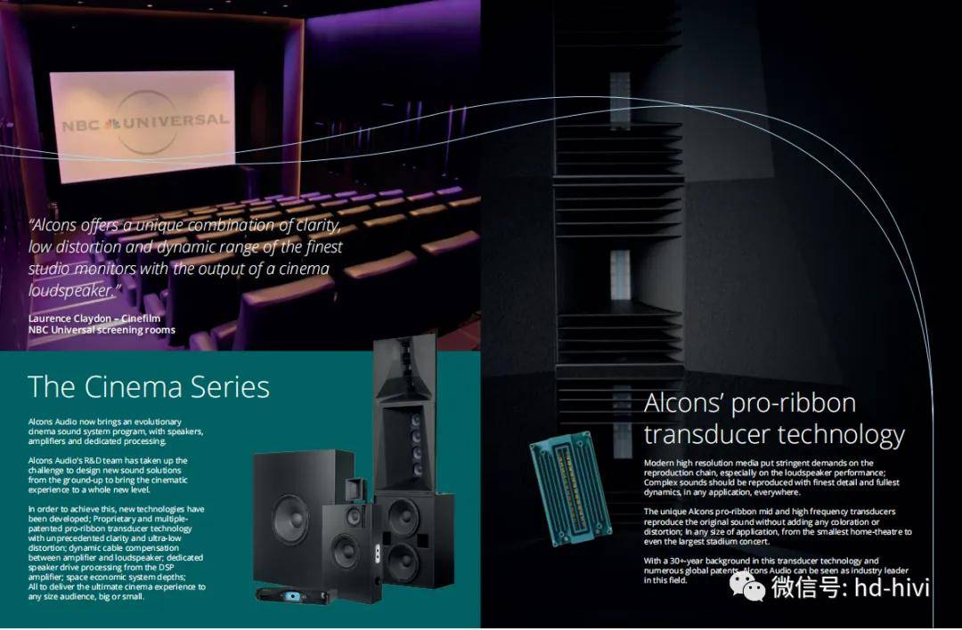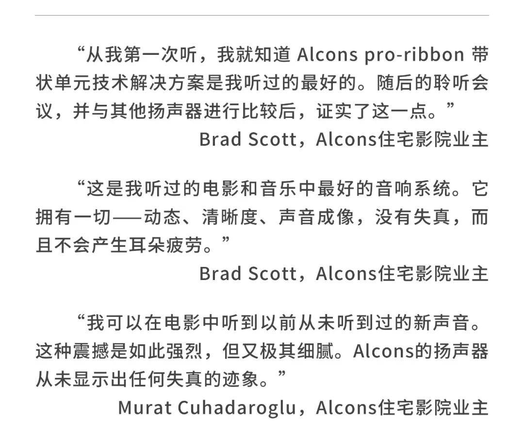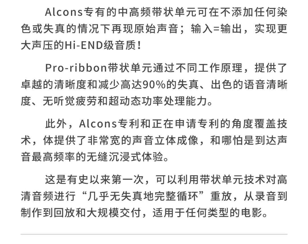 荷兰Alcons(欧凯仕)在传感器和音响系统设计方面拥有大量的专业技术,结合了数字信号处理器(DSP)和扩音器技术,形成了其独特的魅力,铸造了令人惊叹的影院产品pro-ribbon 带状负载式影院音响系统,Alcons 欧凯仕pro-ribbon 技术,无论从细微声音或者到大动态的爆炸声,都能够不压缩1:1还原电影原声,这是全球后期制作室以及全球高标准影院所追求的音响系统。