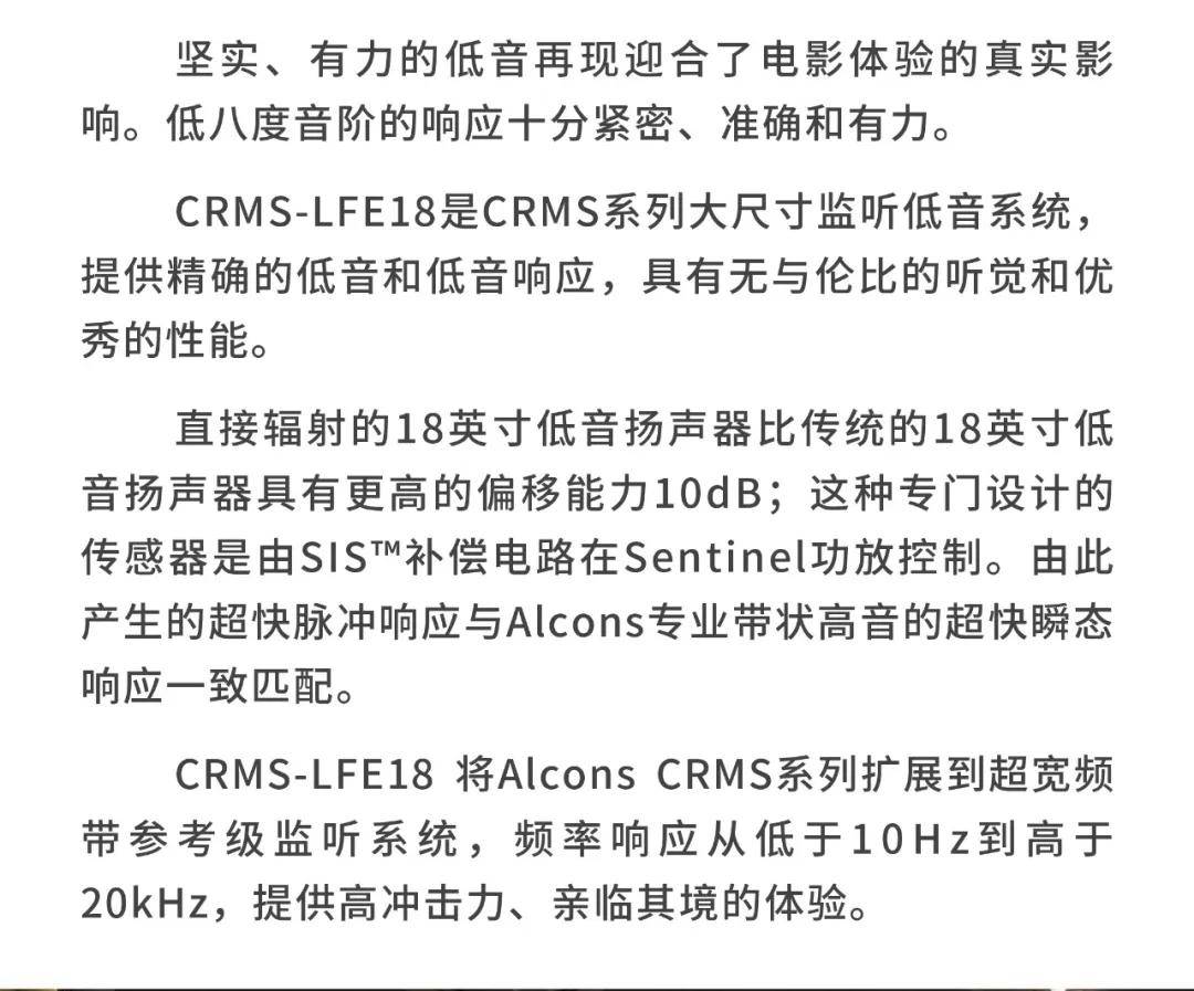 CRMS影院参考监控系统是一个3路音响系统,提供最自然的数字影院和高清音频声音再现。具有专利RBN401专业带驱动器,CRMS结合了卓越的清晰度和可理解性,与异常高的净空声压级。Alcons pro色带驱动器比任何传统的中/高换能器的失真降低高达90%,而非常高的峰值功率处理提供1:16 RMS-to-peak ratio,使最大的屏幕补偿,而不会对驱动器造成任何声音压力。