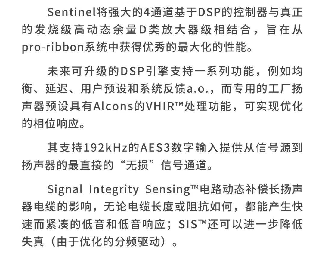 ALCSentinel10 具有强大的4通道dps基控制器与ClassD放大器级。4个单独可寻址输入接受模拟或高达192 kHz的数字AES3信号,可向上/向下采样至96 kHz。由定制的高端采样速率转换器。未来可升级的强大DSP引擎,即使在处理最复杂的(IIR, FIR)算法时,也能将延迟降至最低。功能包括6波段(货架/通/参数化)每个通道均衡,延迟,所有系统和系统配置的工厂预设,用户预设,事件记录和系统反馈。